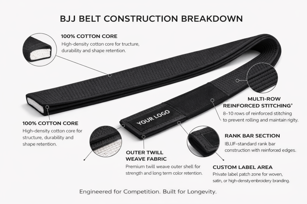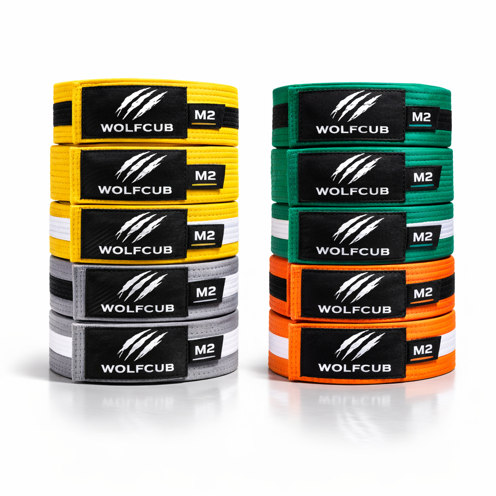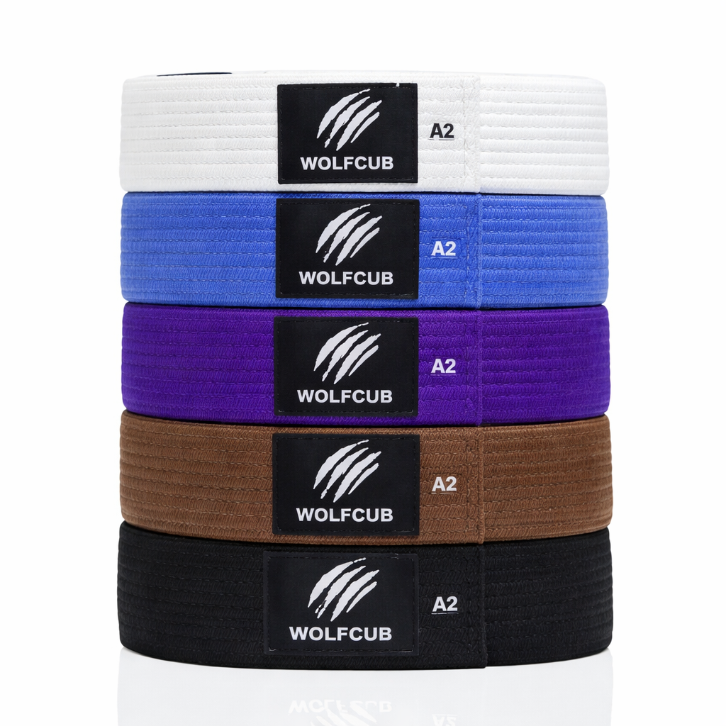 Belts BJJ BELTS BJJ Belts Manufacturing with WOLFCUB IBJJF-Compliant Rank Belts White to BlackA0–A5IBJJF standard width & thickness100% quality cotton Kids Rank Belts Grey/White to Green/BlackM0–M4 (or your sizing)Stripe-ready construction100% quality cotton Private Label Belts Custom woven labelEmbroidered academy logoMOQ options Construction Breakdown Request Belt Production Quote